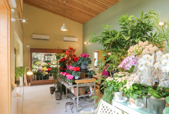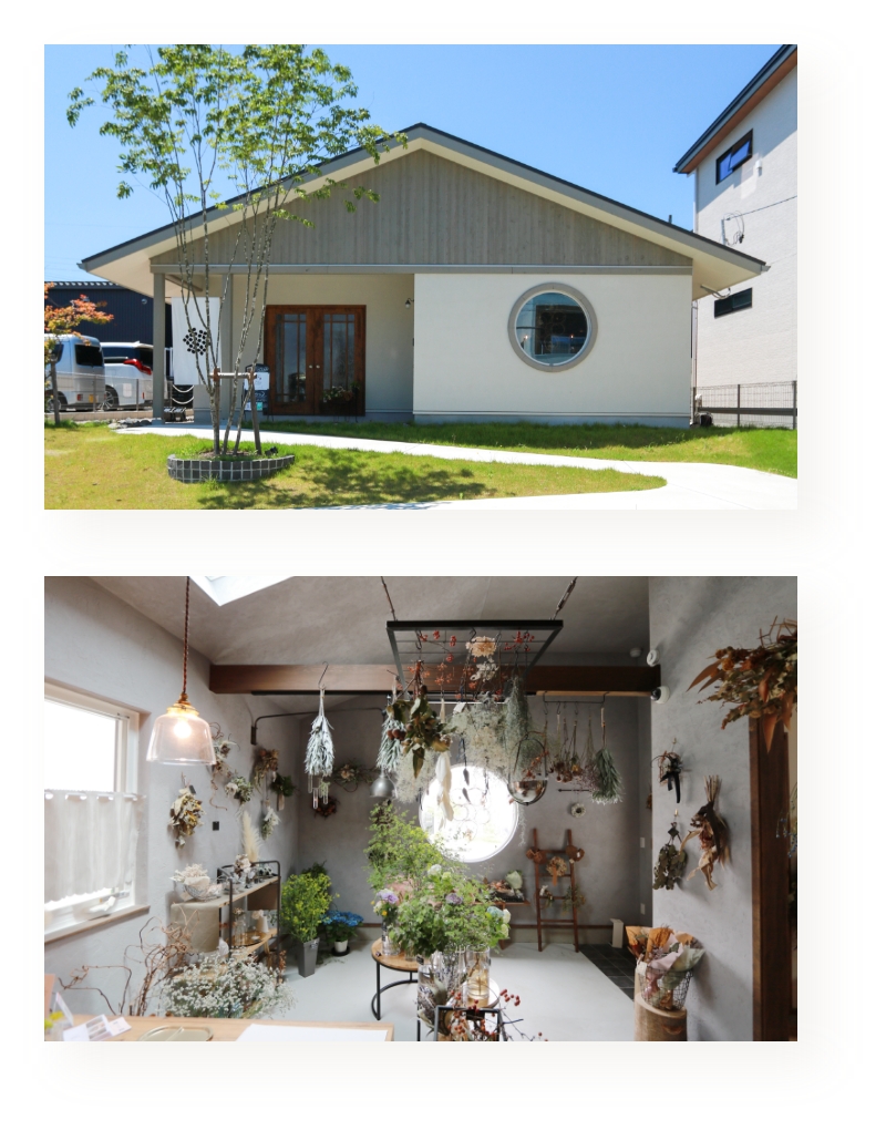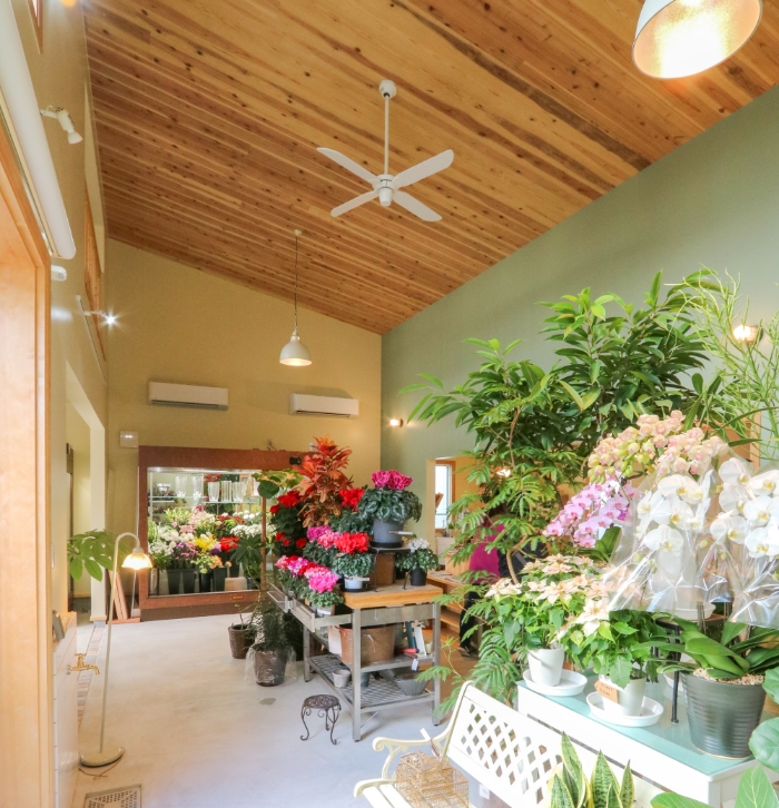 フラワーギフトの販売やアレンジメントレッスンを行うアトリエです。全面に出した天然木の素材と和の雰囲気を取り入れたデザインが特徴的な平屋を設計しました。