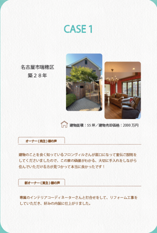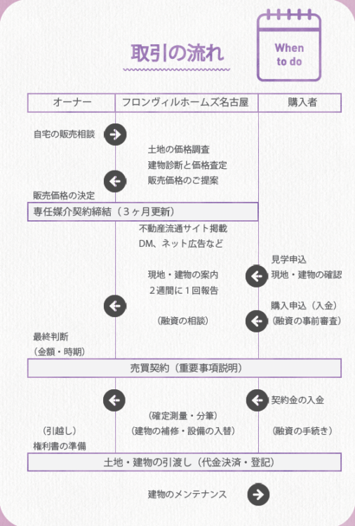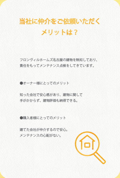 フロンヴィルホームズ名古屋では、オーナー様の不動産売却仲介も承っております。 長年にわたり点検・メンテナンスを行ってきた建物だからこそ、その価値を正しく理解し、責任をもって次のご家族へとつなげていきます。