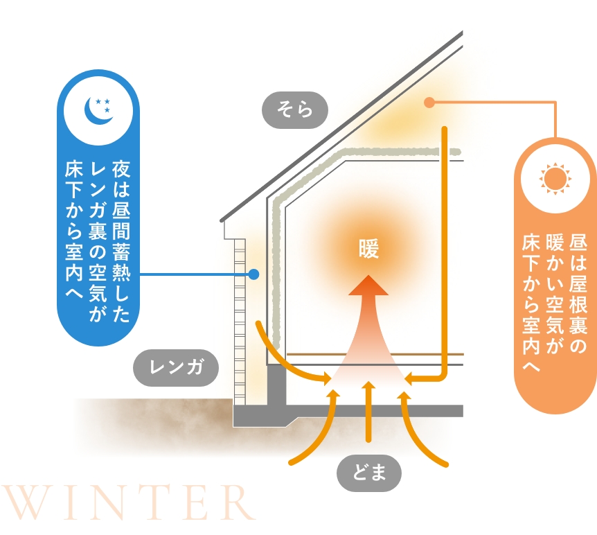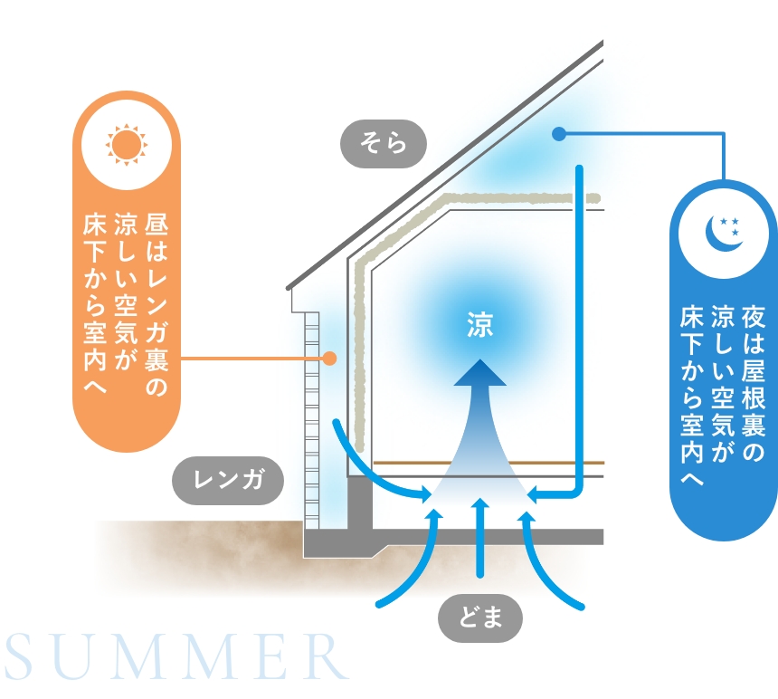 レンガのそらどまは、レンガ積みだからこそ可能な「外壁二重構造」を活かし、屋根裏と床下(どま)の温度差を使って、空気を自在に循環させて室温を調整する次世代の環境配慮型換気システムです。夏の日中は、レンガ裏の涼しい空気が床下を通じて室内に循環し、夜は涼しくなった空気が屋根裏の床下を通して室内に入り込みます。また、冬の日中は、屋根裏の暖かい空気が床下を通して室内を温め、夜は昼間蓄熱したレンガ裏の空気が床下を通して室内に入り込みます。