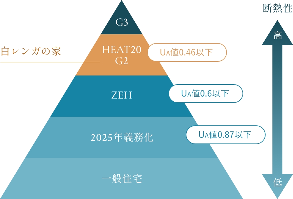UA値とは、外皮平均熱貫流率のことであり、建物の内部から外に逃げる熱量を表します。この値が低いほど断熱性能が高いと言われています。
