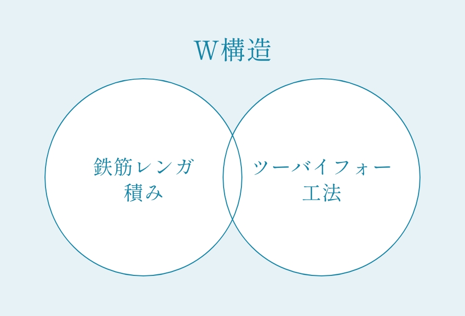 白レンガの家は、鉄筋レンガ積みとツーバイフォー工法の二重構造を採用することで、高い耐震性を実現しています。