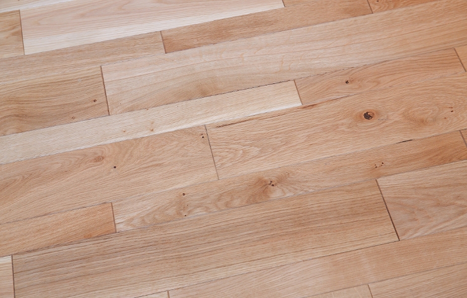 幅の異なるホワイトオークを互い違いに、大工が手作業で一枚ずつ張り合わせます。無垢ならではの木の表情と、異なる幅が調和して独特のリズム感を見せる、アメリカでは伝統的で根強い人気を持つデザインの一つです。