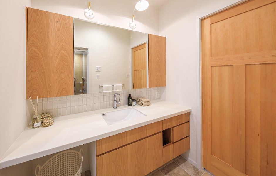 完全オーダーの洗面とキッチン - 冷蔵庫や家電は目立たない場所へ