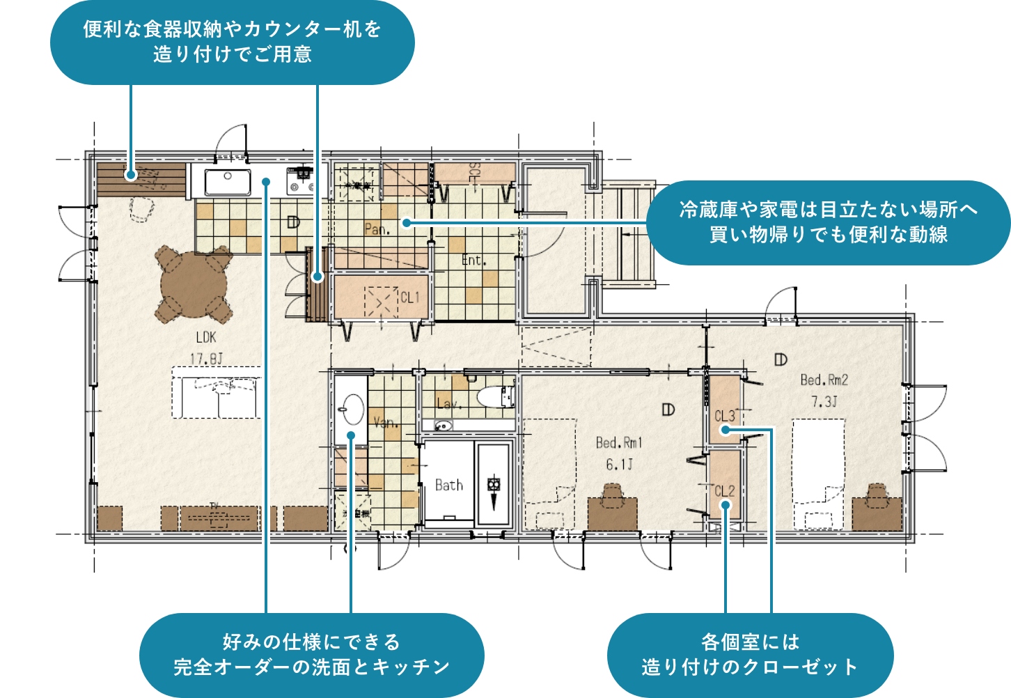 レンガを積み上げる工程や素材、設備などすべて本物にこだわっているからこそ、私たちはお客様とじっくり向き合いながら家づくりを進めたいと考えています。白レンガの家は、そのほとんどを職人の手作業で仕上げており、特にキッチンや洗面はお客様の暮らし方に合わせた世界に一つだけのオーダーメイド仕様です。