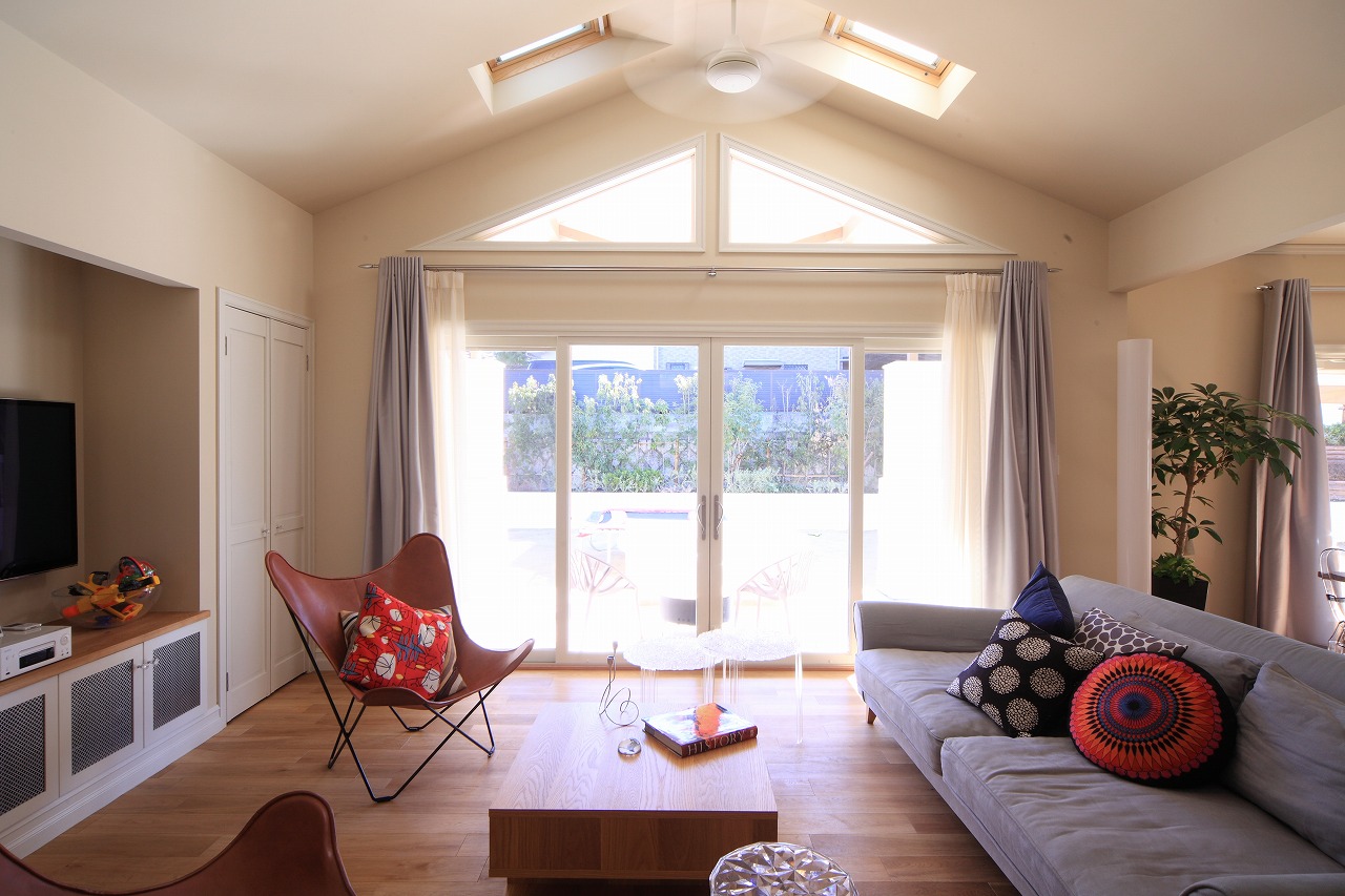 毎朝7時、家中のスピーカーから流れる、オーストラリアのラジオ番組。奥様のKさんはホールのスピーカーの音量を上げて、なかなか起きてこないお嬢さまたちを部屋の外へ呼び出します。御一家はオーストラリアで、築100年以上の英国コロニアル様式の家に10年間ほど住んでいらっしゃいました。2004年夏からは日本での生活をスタート。Kさんにとっては馴染みのない賃貸マンションでの生活でした。その後念願だった、庭付き一軒家に引越しされましたが、家の中でも寒くて常にダウンジャケットを着たままだったそうです。この家で暮らしはじめ、Kさんが家の中でダウンを着用することはなくなりました。それだけでなく、ホコリなどのアレルギーが治ったという嬉しい変化もありました。住み心地をお聞きすると、「comfortable(快適)」と一言。今は外出よりも帰宅が楽しみになっています。もう一つのリビングとダイニングが広がるアウトドアテラス、その先の庭で遊ぶお嬢さまたちの様子を眺めながら、「ここが自分の家だと、まだ信じられない時があります。とても幸せな気持ちですね」とおっしゃいます。
