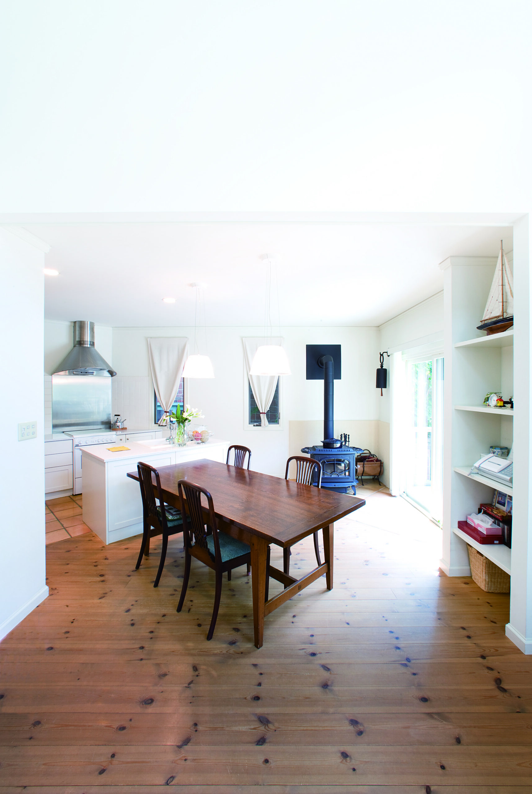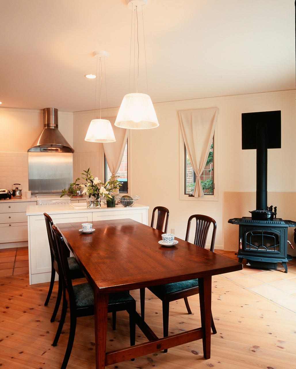 「提案されたパースを見て、自分の価値観やスタイルを共有できたという実感があった」と仰いました。提案プランをベースにした案を、選択していくという作業を中心に進んでいきました。家族が集うのにふさわしい穏やかな空間には薪ストーブを設置。ひときわ優雅な雰囲気を醸し出しています。