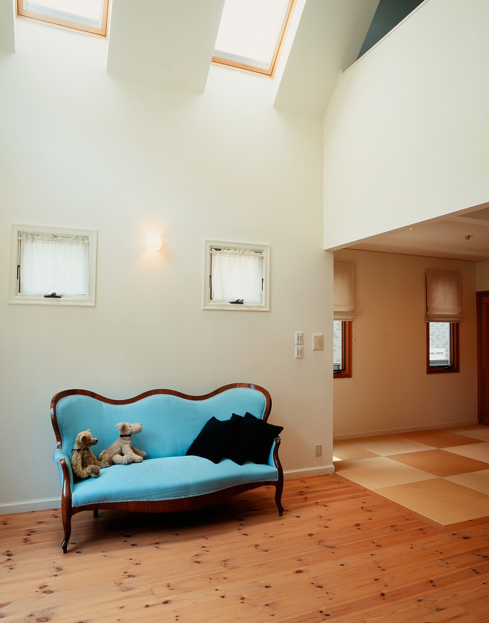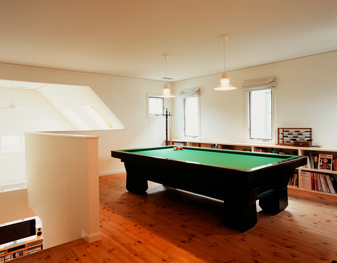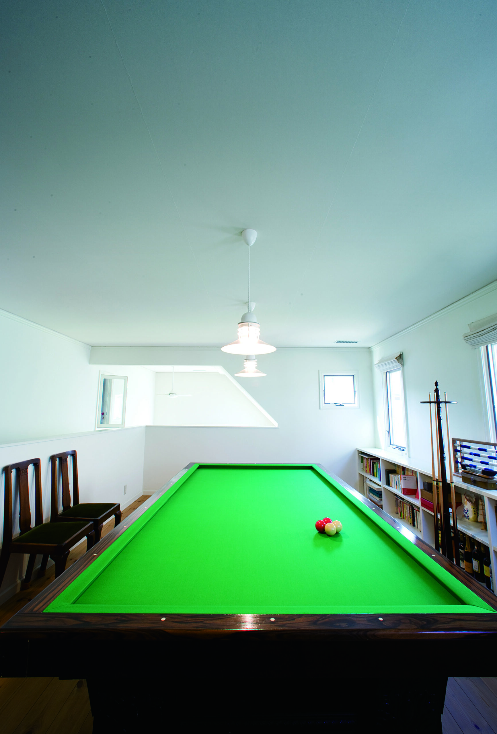 「華美でなく、モダンでもなく。それが私の求めた住まいです」。そう語るご主人にとっての住まいとは、建てるだけで完成するものではないと仰います。住まう人が、いろいろな想いを込め、少しずつ育てていくという考え方。まさに、無垢材の床、塗り壁、そしてアンティークの家具が調和した空間は、ご家族と自然にとけ込んでいます。そして深い味わいを感じさせる。それは、同じ時間を過ごしてきたことによって生まれる連帯感なのかもしれません。ご主人の住まいづくりにおいて、重要なカギになっているのが「趣味」。ヨットやクルマ、音楽、サッカーなど幅広い趣味をお持ちです。ご主人にとっての趣味は、個人で楽しむためと同時に、家族をつなぐためのものでもあるとのこと。たとえば、ヨットは家族と過ごす時間を増やしたいという想いからはじめた趣味。学生時代からはじめているサッカーは、子どもたちもはじめたことで、親子共通の趣味に。2階に置かれているビリヤード台も、家族の会話のきっかけになればという想いがあったそう。さらに、リビングとダイニング・キッチンをひとつの空間にしたのは、家族の集まる場所をつくりたいという想いから。