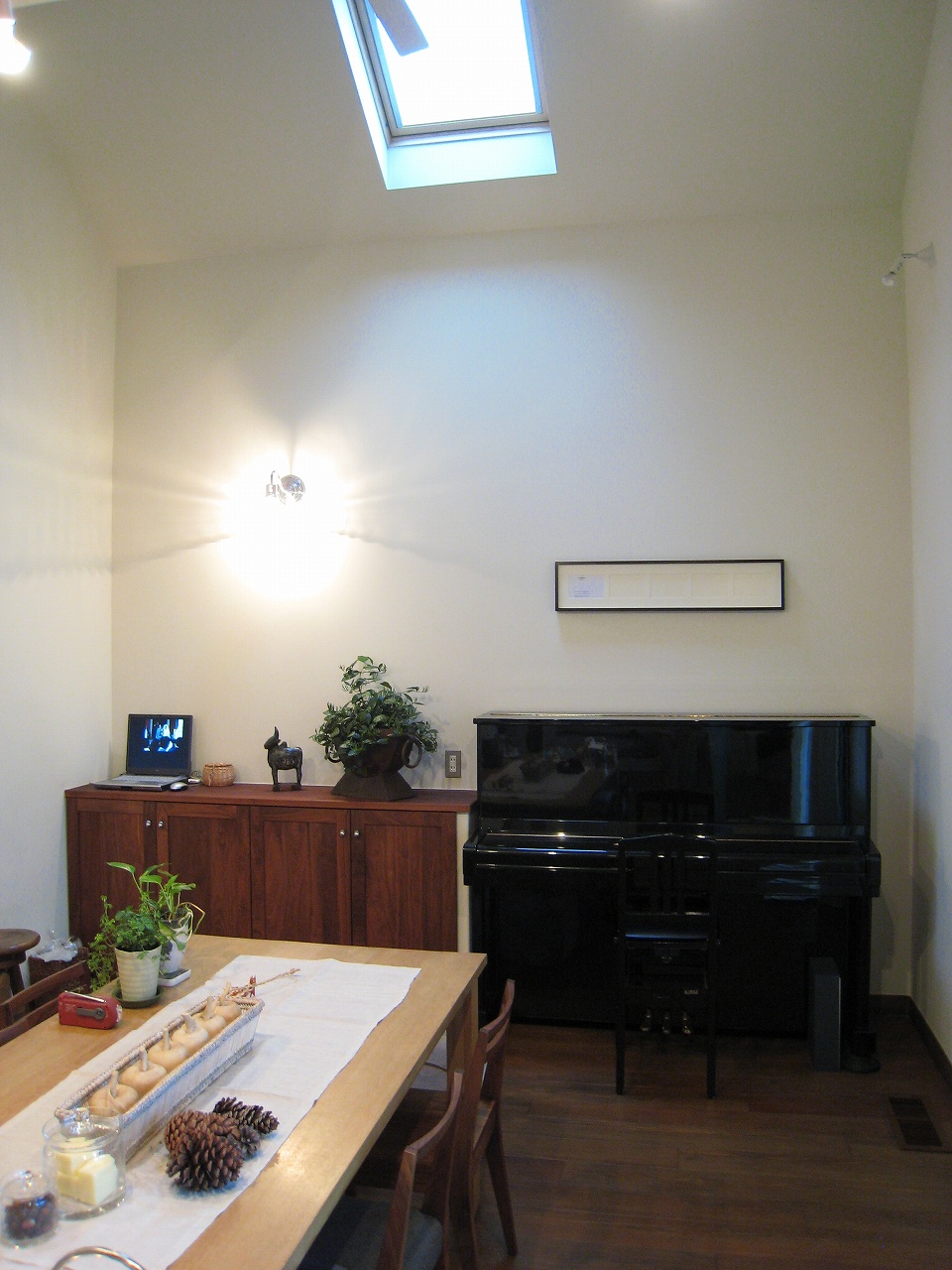 トップライトのガラス窓が作る四角い光のシルエットが白い壁を這うように進むE邸のLDK。この壁は赤ちゃんがなめても安心という水性ペイントで塗られています。「小さい子どもが壁を汚しても安心。水性ペイントなら自分で何度でも塗り直せます」。実際、入居後に幾度となくペイントしたと語る奥さま。「子供が幼稚園に行っている間に乾いてしまう」と笑います。