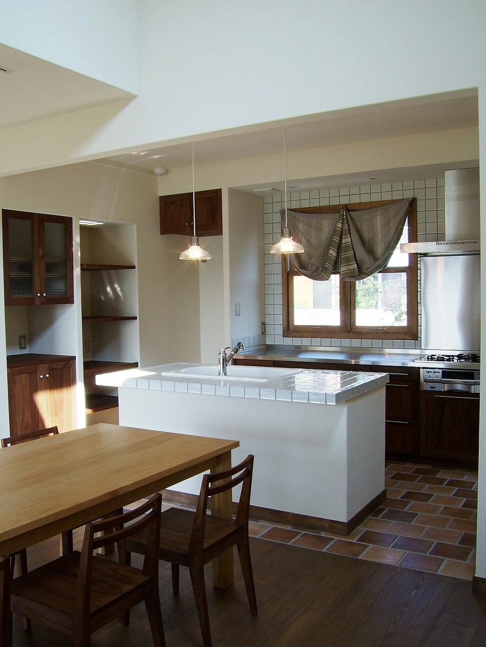 床のタイルは古レンガをスライスしたもの。レンガ目地がタイル面を覆うように特別に注文をつけた。「荒っぽく仕上げてください、と現場で職人さんに伝えました」