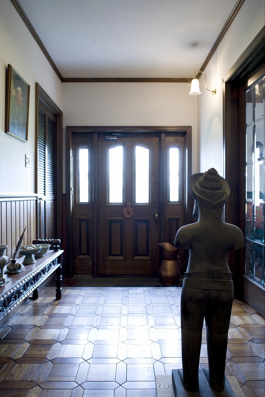 玄関ホール正面に置かれた花台は、やはりくるみ材でイギリスの年代物。優美な脚のデザインに注目。