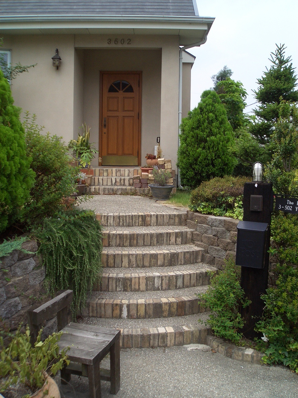 アプローチと玄関のステップのエッジにはレンガを縦にして用いた。タイルをポーチのアクセントに。