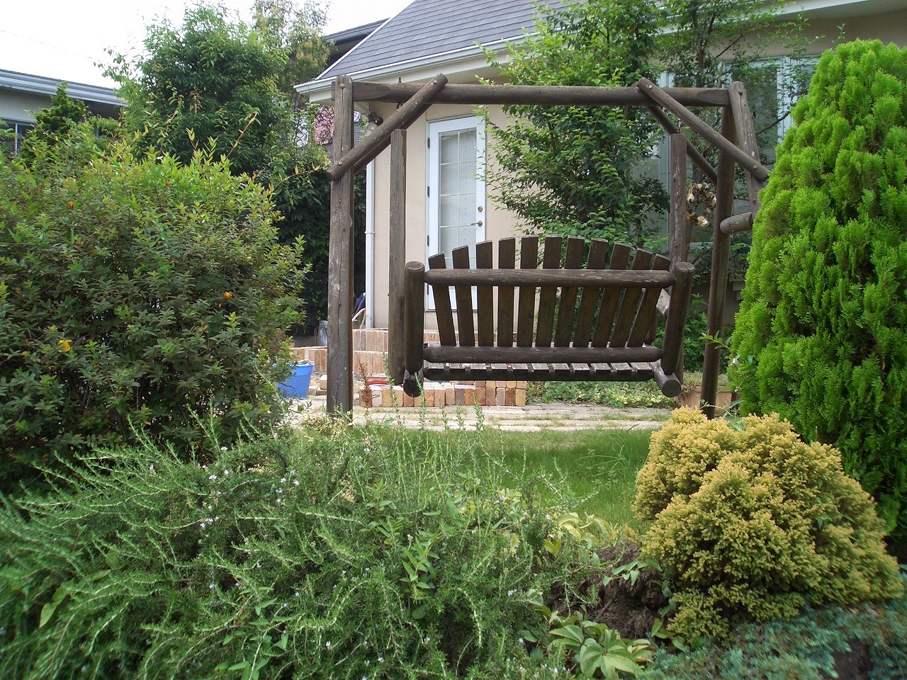 また、子どもたちのためには砂場を設けました。さらに、ご主人が木製の大きなブランコを作り、子どもたちは大喜びです。道路に面した側面をぐるりと囲む花壇は、園芸好きのご夫妻の手入れがよく行き届き、いつも美しい緑を保っています。