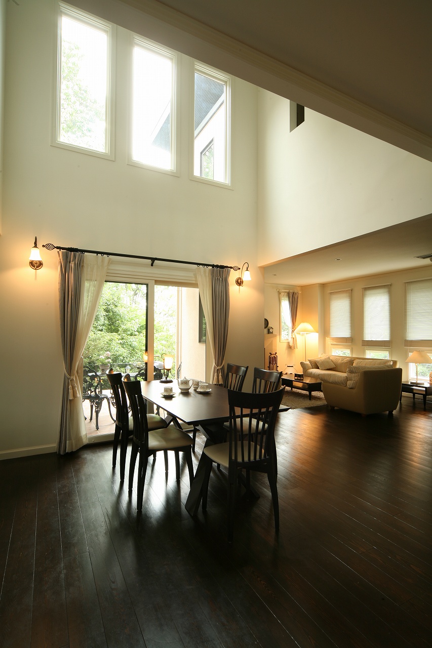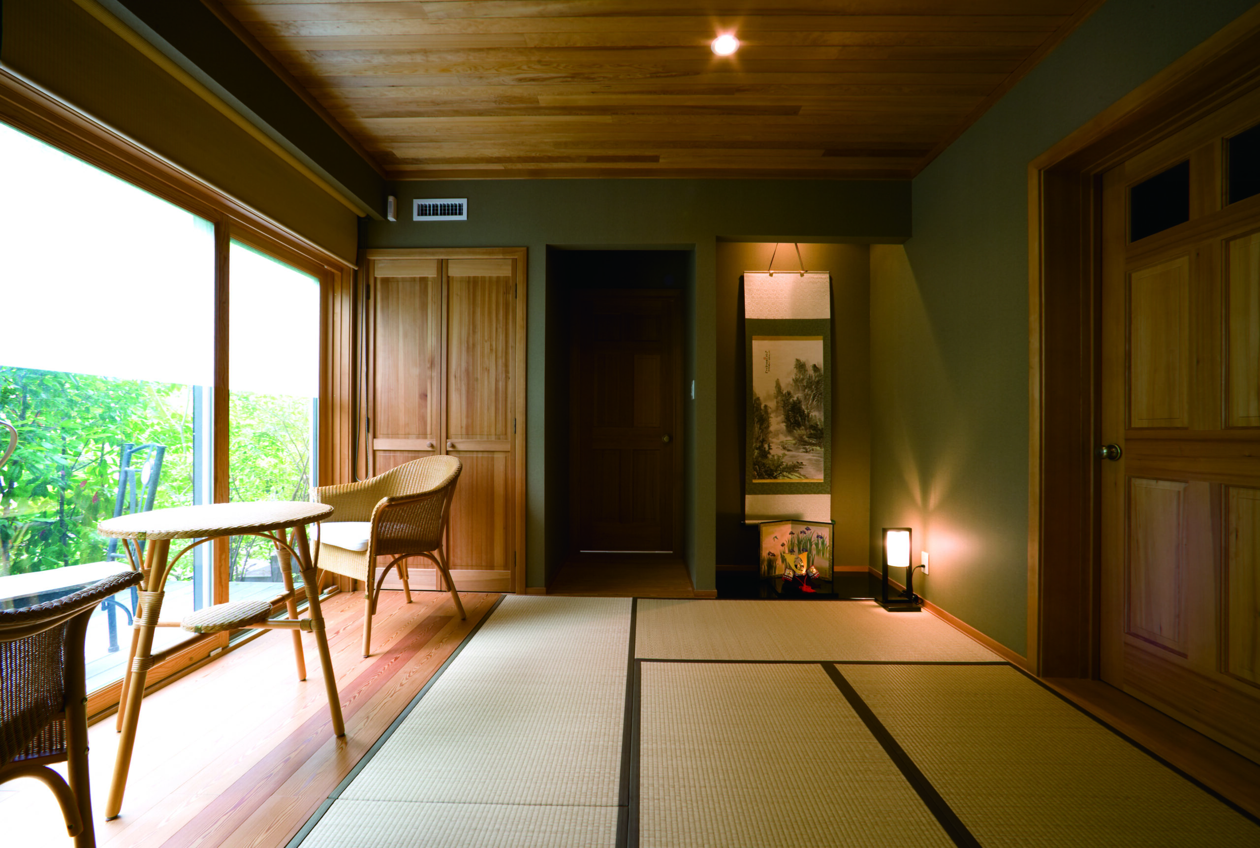 アメリカでの在住経験を持つKさん。海外では知人の私邸に宿泊する機会も度々あるそう。また、その逆に彼らが訪ねてくることもあるそう。こうしたご経験からか、外国の人が自然に溶け込める家、外国の人が泊まっても違和感のない家をめざしたと語ります。無垢材の床、塗り壁はもちろん、そのこだわりを端的に表現しているのがゲストルーム。将軍ルームと名付けたこの部屋は、まさに日本旅館を彷彿とさせる。外国の知人のためにテーブルと椅子がセッティングされています。国籍を問わず知人が気兼ねなく宿泊できるよう、家族のスペースとは別のフロアに設けたそうです。