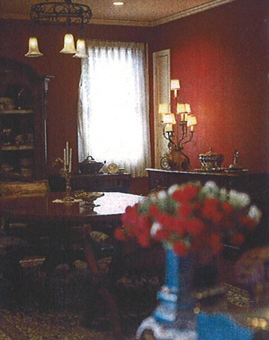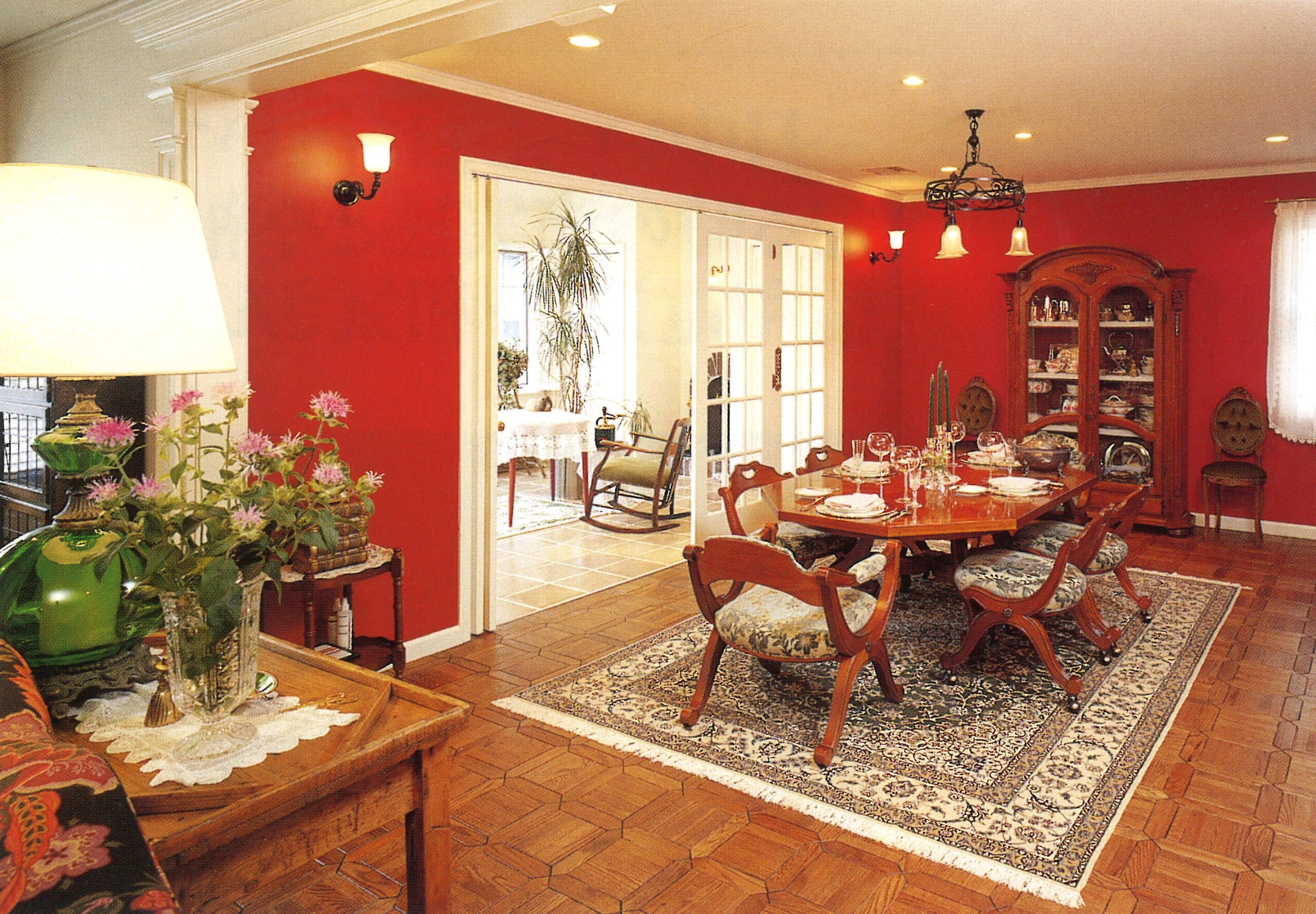 隣のダイニングの赤い壁にも調和している。暖炉前の赤い花柄のソファーは、かつてマンションの和室に合わせて使っていたもの。