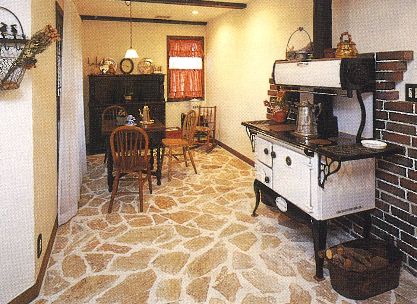 そんな台所には薪で調理するクッキングストーブや、ざらざらした感じの石がよく似合う。床の石は、石英石(天然石)で素材の特性をいかして乱貼りにしました。土っぽい雰囲気を出すためです。