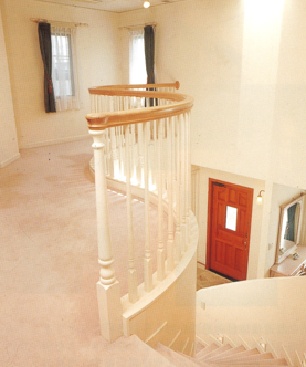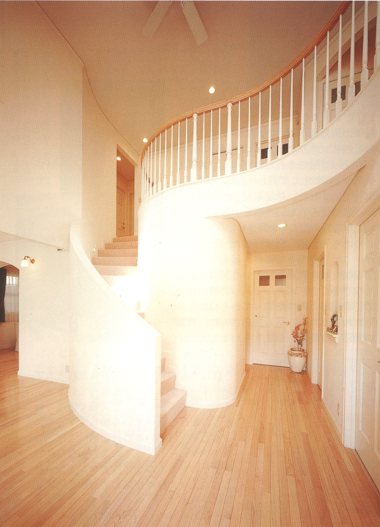 玄関の周りに貼っているのは、カルチャードストーン(人造石)。こうした石の使い方もボリュームが増えれば、くどく重い感じになるが、ここではこのカルチャードストーンが外観デザインのアクセントとなって外観をいっそう引き立たせています。吹付部分の外壁の色は、穏やかなほんのりピンク系。この色が全体をやさしい感じにしているよう。玄関アプローチやフロントガーデンを含めた全体のバランスもとてもよい。アプローチの手すりのアイアンからサビが多少でていますが、奥様は「これも味ですよ」とおっしゃっています。時間を経て部分的に汚れてくることは、当然のことであるが、厚化粧がはげてくるようなやつれ方ではなく、建物も年輪を重ねた美しさのような古くなり方ができたらすてきです。室内プランにもこの外観イメージは引き継がれ、玄関扉を開けると正面に柔らかな曲線を描くらせん階段が現れます。