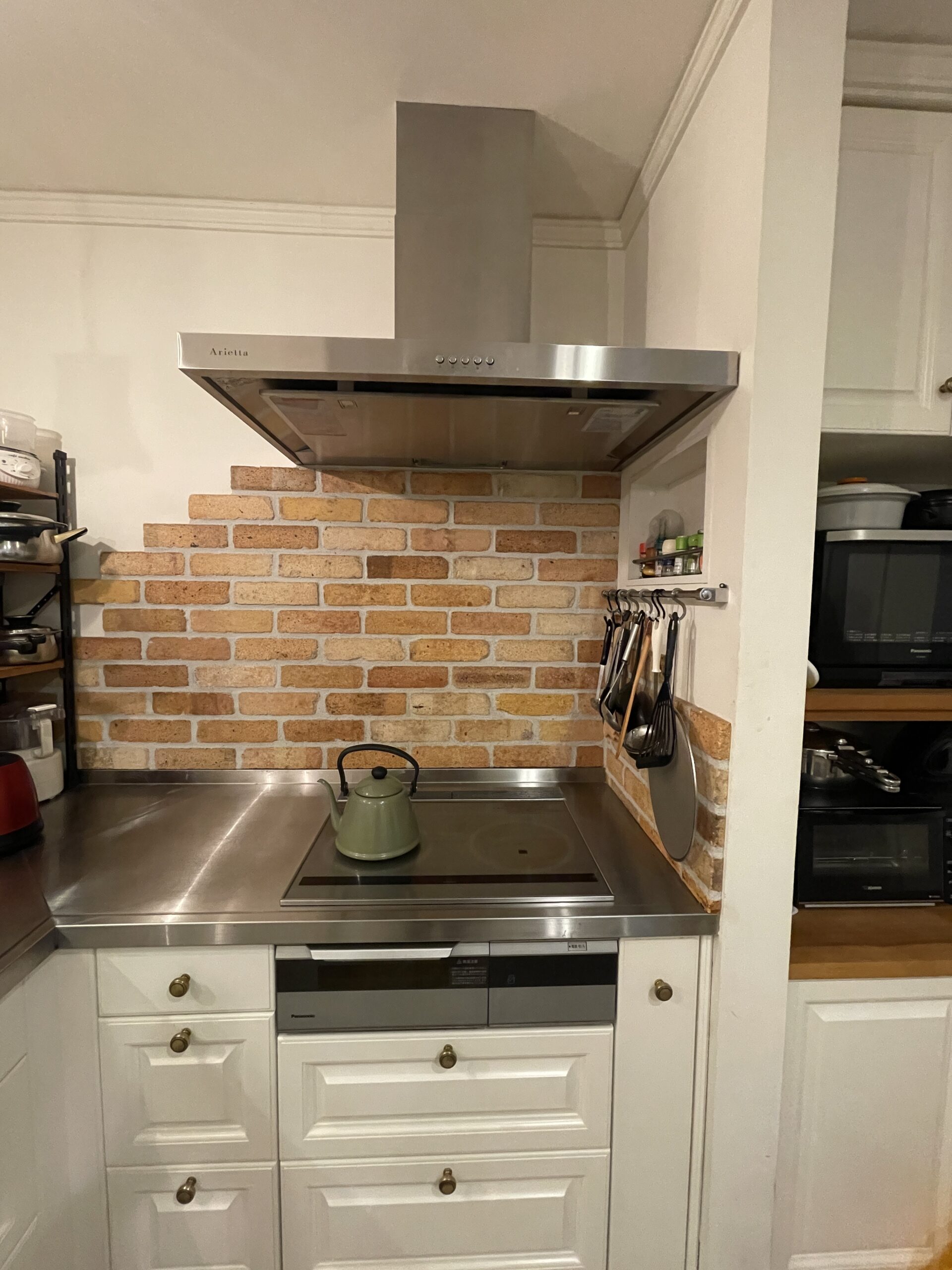 前壁のレンガはお手入れ不要とのことで、お気に入り。お好きな木と黒鉄の組み合わせラックはご主人の手作り。