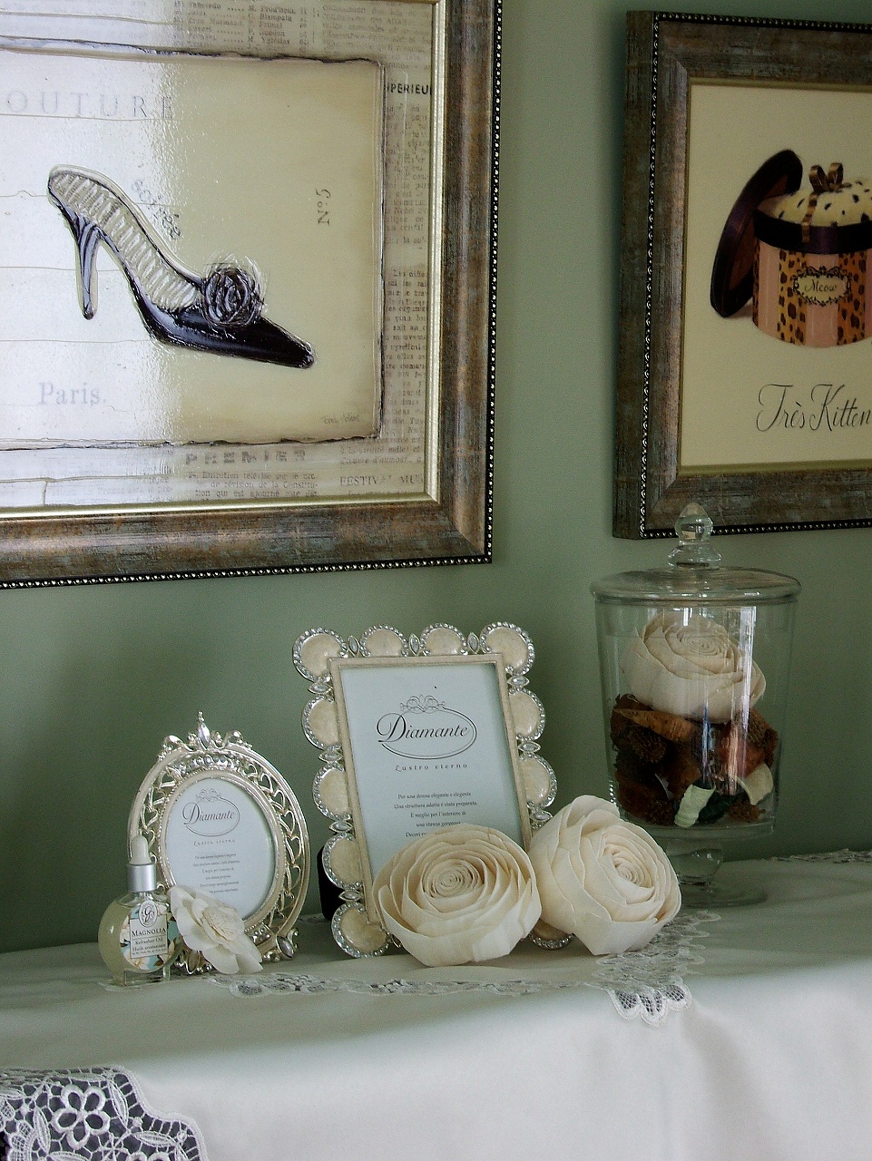 リビングのピアノ上は、シャビ-なアートフレーム、シルバーの写真建て、コサージュなど‘フレンチシック‘なテイストでまとめ、統一感のあるディスプレイ。
