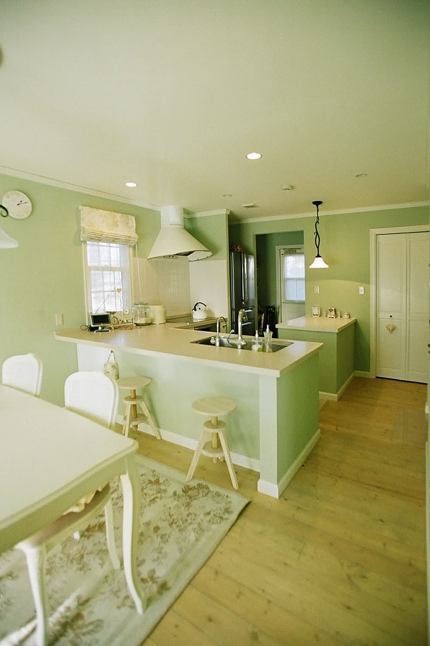 お料理とお菓子作りが好きな奥様は、これまでのキッチンの問題点をしっかり検討してレイアウトやスペース配分を考えました。まず、以前は独立型で料理をしている間家族と会話ができなかったので、今回はダイニングと一体型のオープンキッチンに。「特に焼き菓子は、焼き上がるまでオーブンの中の様子もときどき見ないとならないので、キッチンから離れられなくて、キッチンまわりですべての家事がこなせるように、すぐ脇にワークコーナーを作りました」そして、使い勝手があまりよくないうえに、圧迫感もある吊戸棚は一掃し、パントリーを設け、インテリアの雰囲気に合わない冷蔵庫や家電類は、仕切り壁をうまく使いダイニング゙から名見えないようにするなど、随所に工夫が凝らされています。