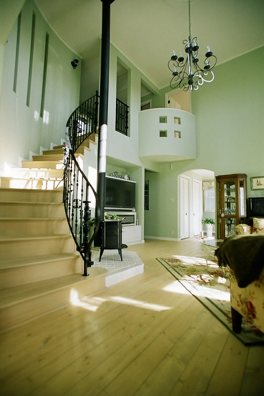リビングの吹抜け天井はメダリオンでドレスアップ。コーニス(回り縁)をあえてシンプルにすることで、メダリオンの美しさと立体感を引き立たせています。