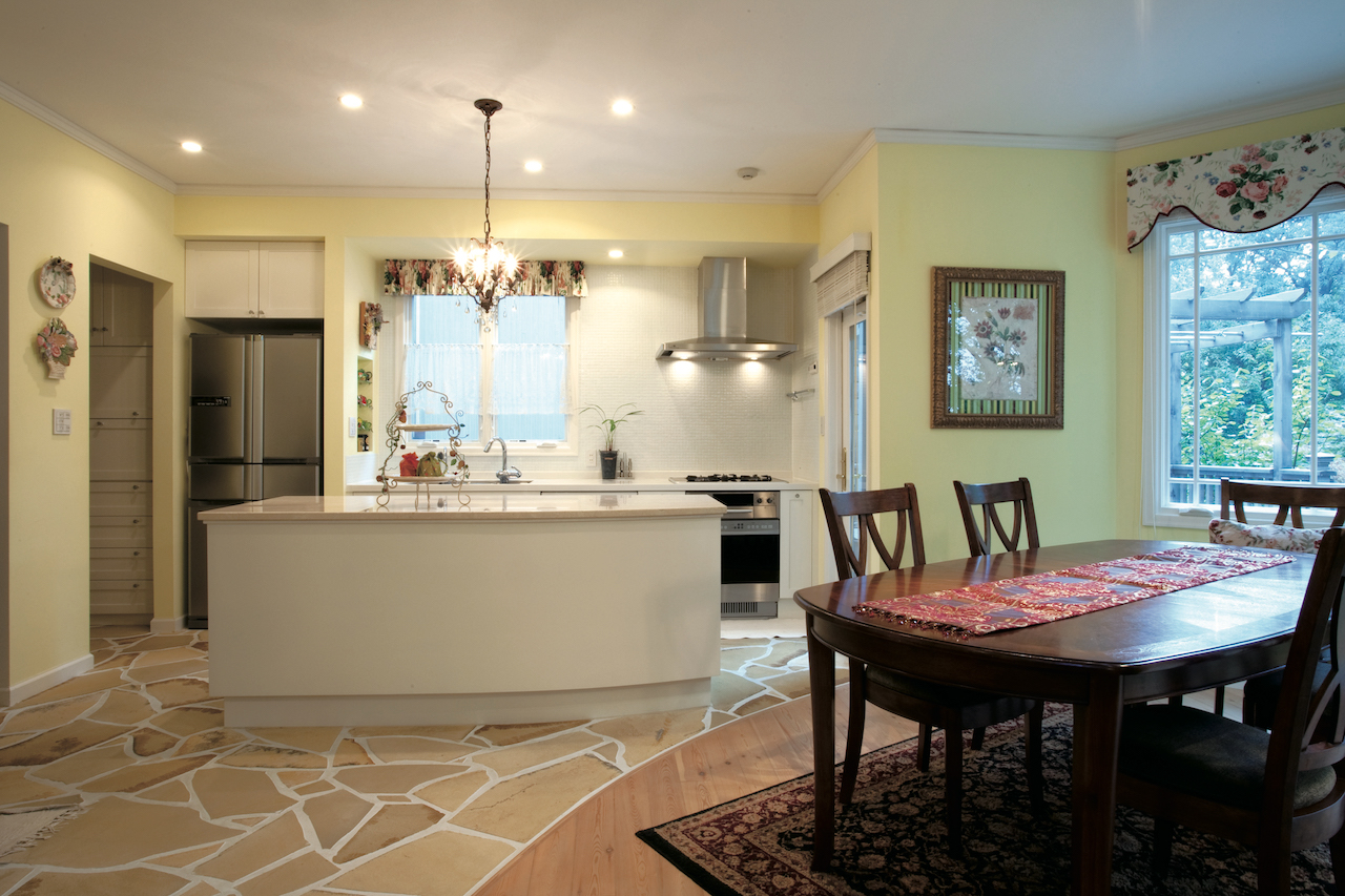 「お菓子作りをするので、大理石トップのアイランドカウンターのあるキッチンが希望でした」と奥様。床は、玄関から続くジュラストーン貼りに。
