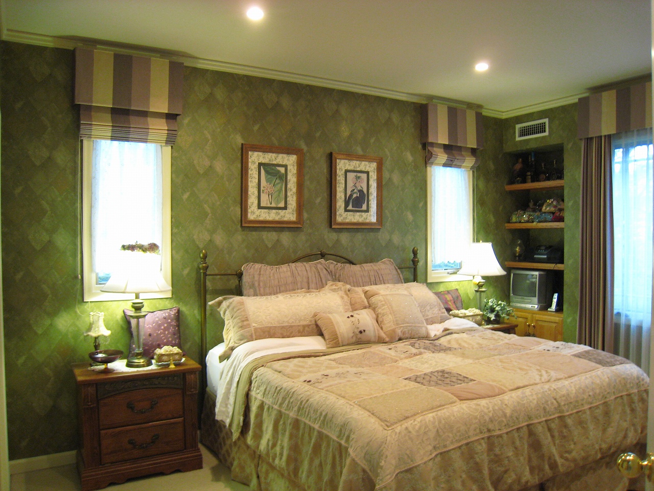 ・主寝室は、テクスチャーのある壁紙を採用。家具のレイアウトを考慮して窓を設け、シンメトリーのインテリアに。