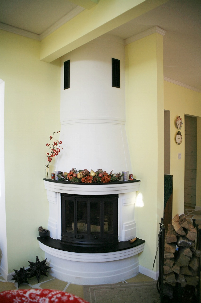 ノルウェー、ヨツール社の薪ストーブは、リビングダイニングキッチンの出入り口横のコーナーを生かして設置。