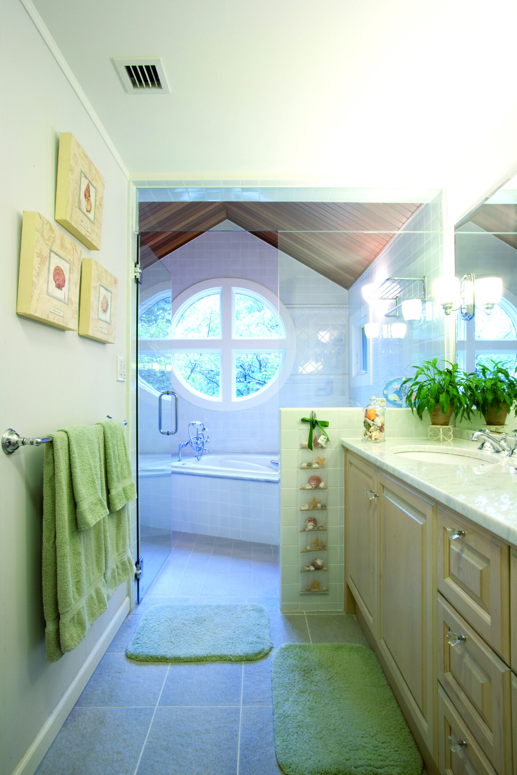 ・ペールグリーンのペイント壁にした次男の部屋は、勾配天井が気持ちいい空間。端に桟が入った窓は、カントリーテイストになりすぎない所がお気に入り。「コストのことも考えて、採用する窓を厳選しました」