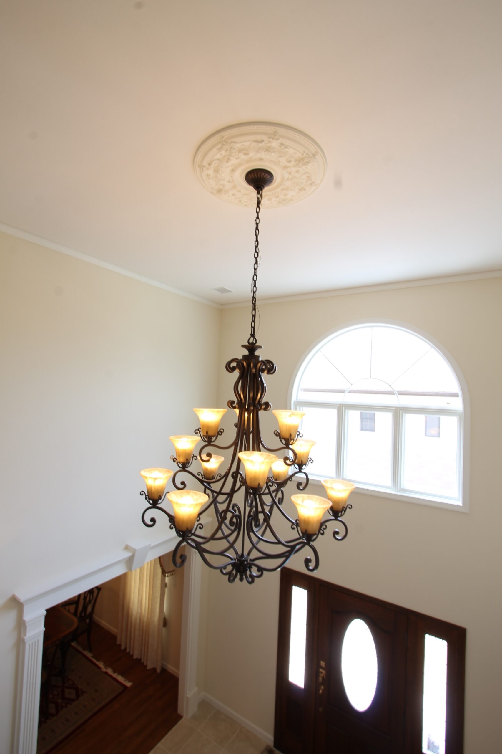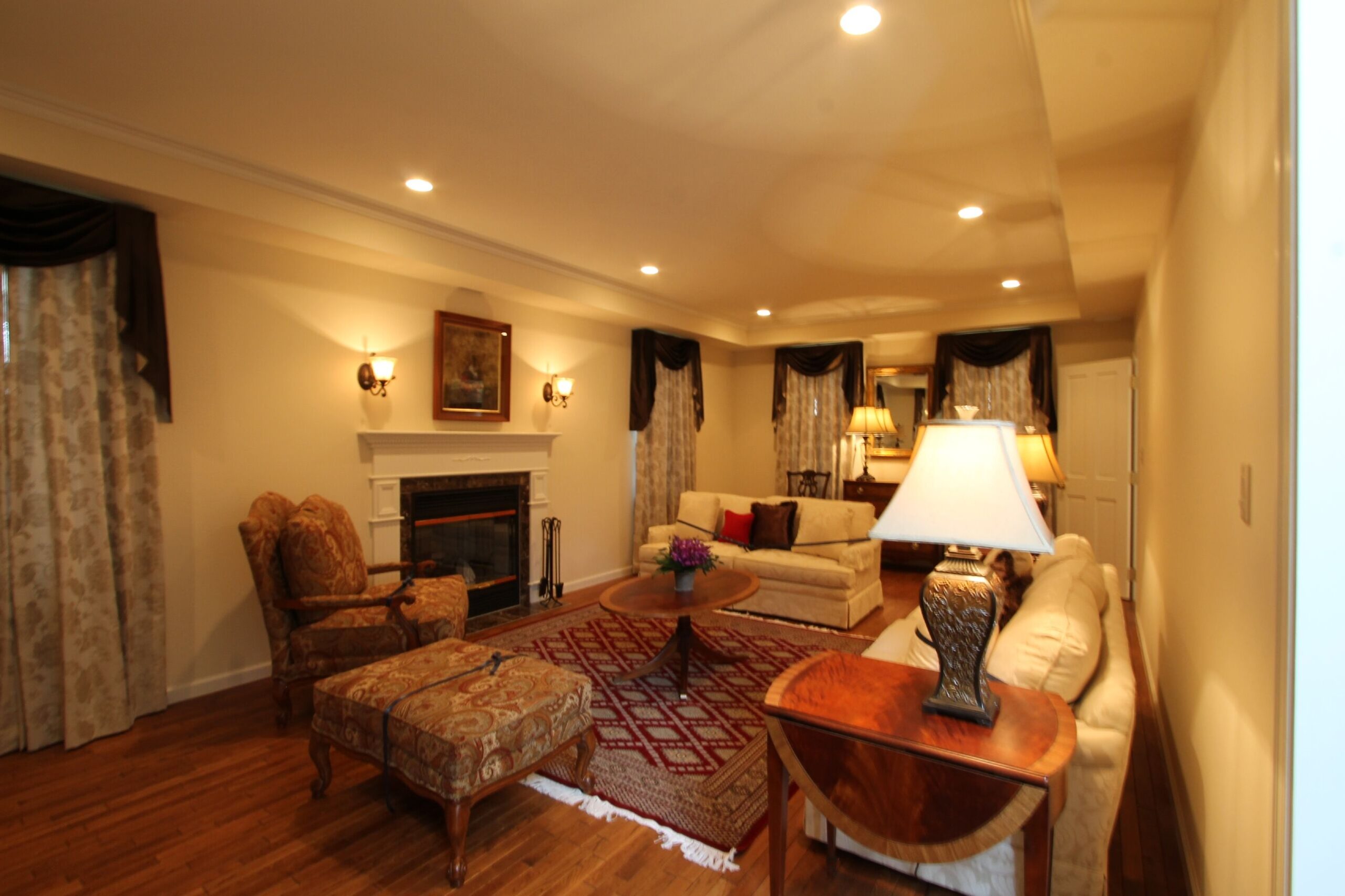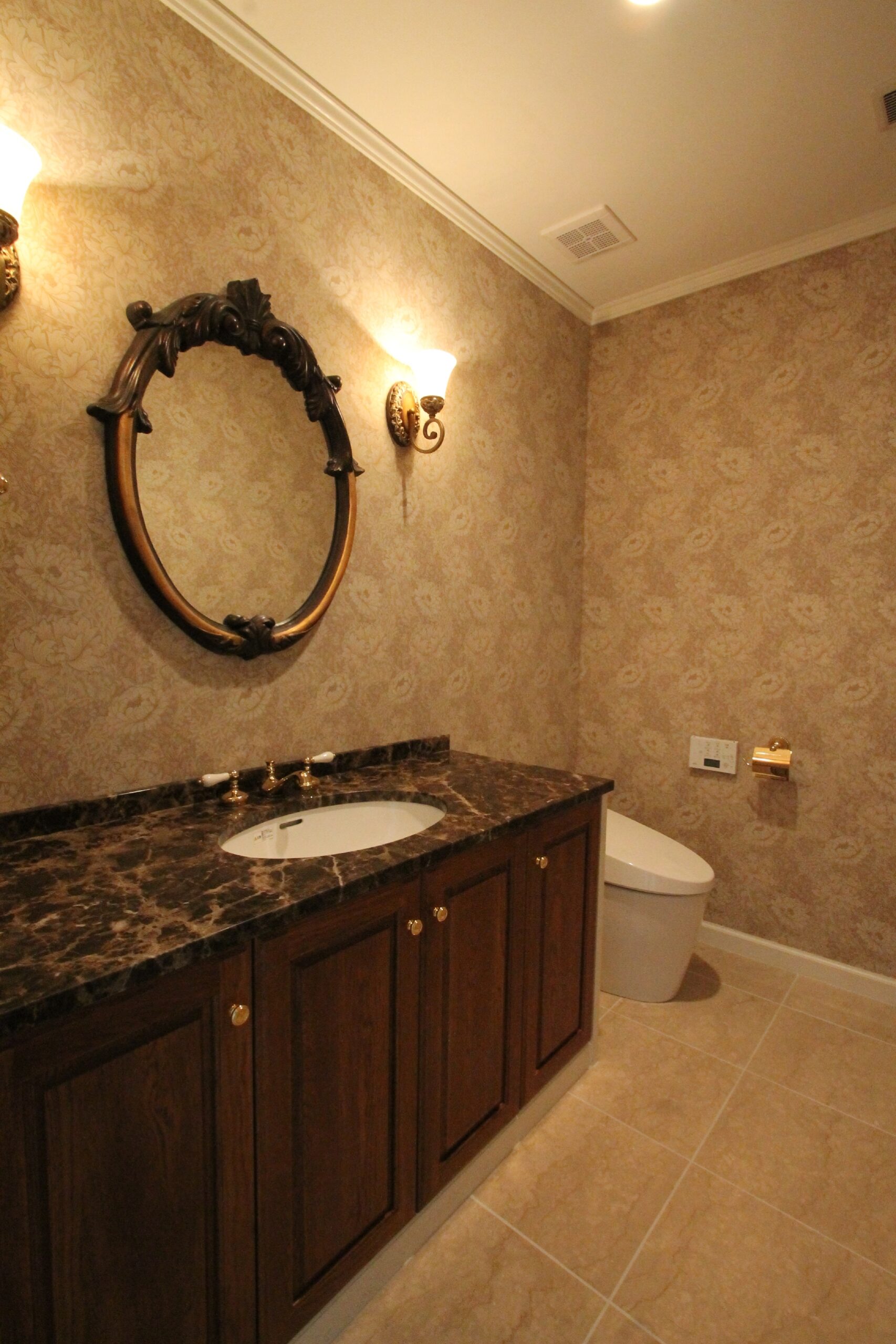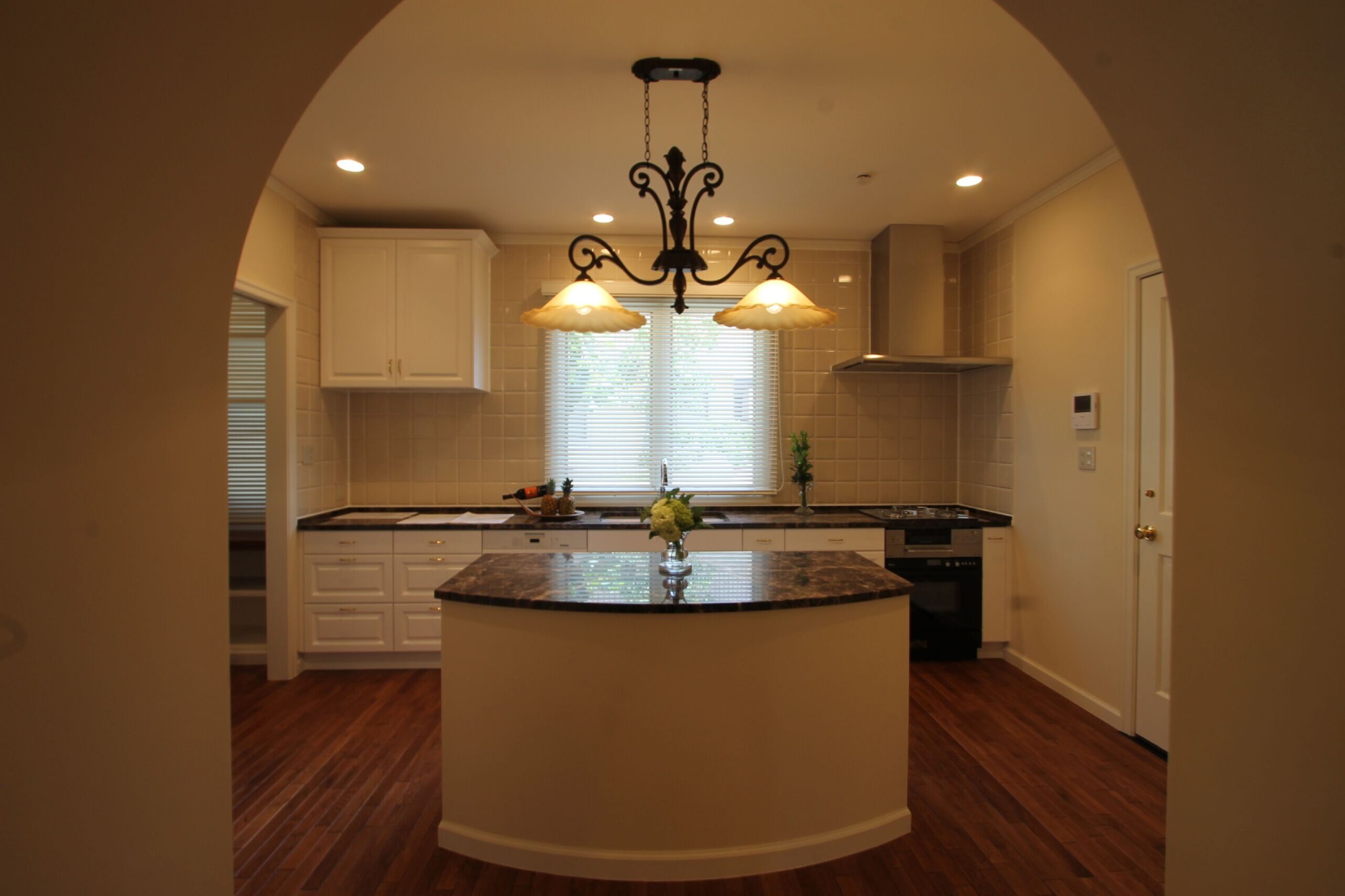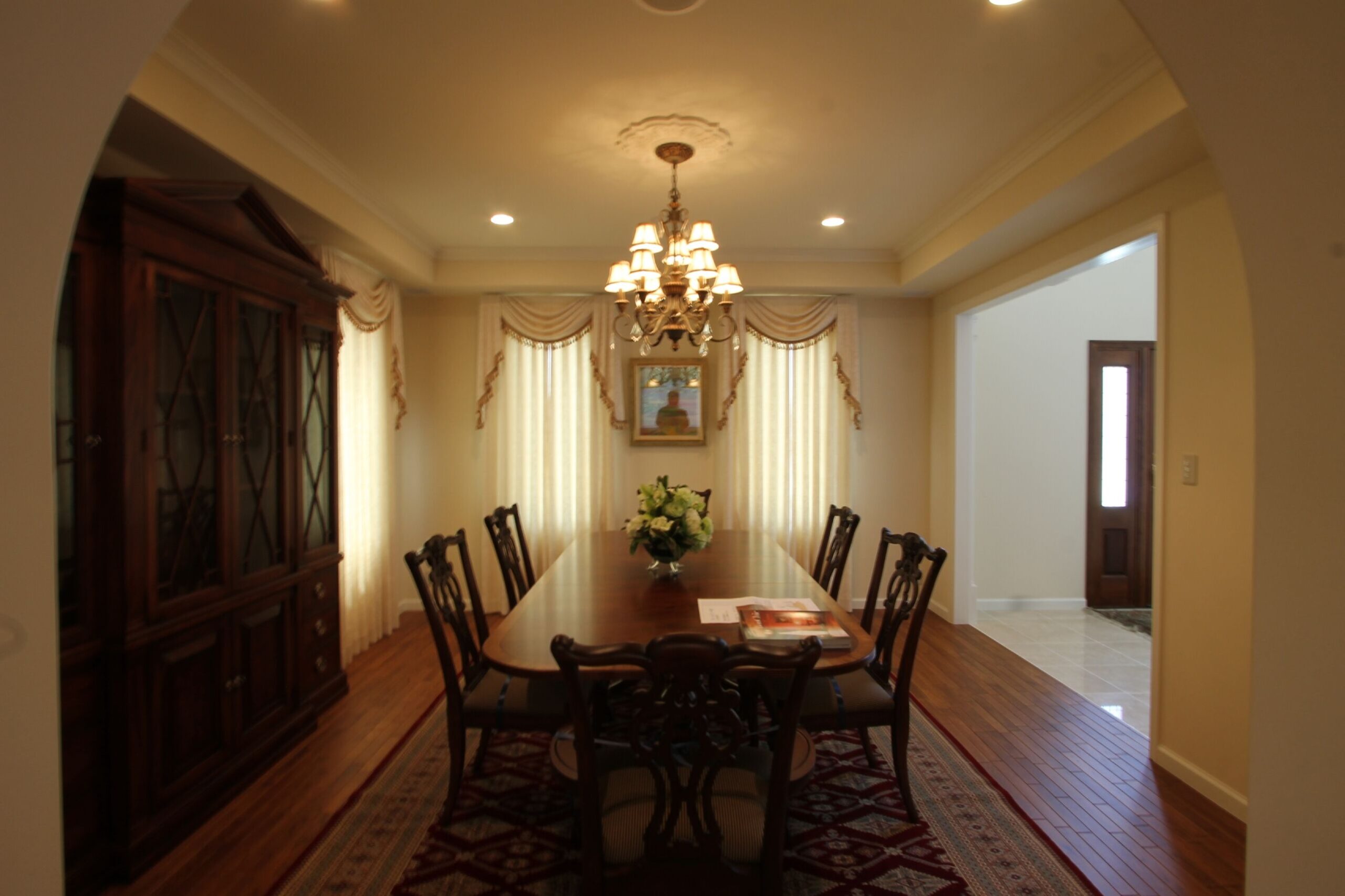 シンメトリーに構成されたダィニング。赤い繊毯で空間を効果的に引き締めています。クラシカルでゴージャスなシャンデリアはKICHLER(キチラー)。トリムをあしらったスワッグ&テールのウィンドウトリートメント。ダイニングテーブルとカップボードはイーセンアーレン。カップボードは当初はローボードの予定でしたが高さのあるものにしたことで、空間がぐっと革やかになりました。食卓を美しく照らすダブルシャンデリア、そしてそれらを調和させ、引き立てている深紅の絨毯。ジョージアンの建築様式をベースに、ニュートラッドの流れをとり入れ、装飾を抑えてしつらえた格式高い空間には、上質なくつろぎ感が漂います。トラディショナルで品格のある空間でありながら、ジーンズで過ごせるようなリラックス感のある家が理想だったというオーナー様。アメリカの上流家庭のライフスタイルを思わせる、上質な日常が垣間見られます。