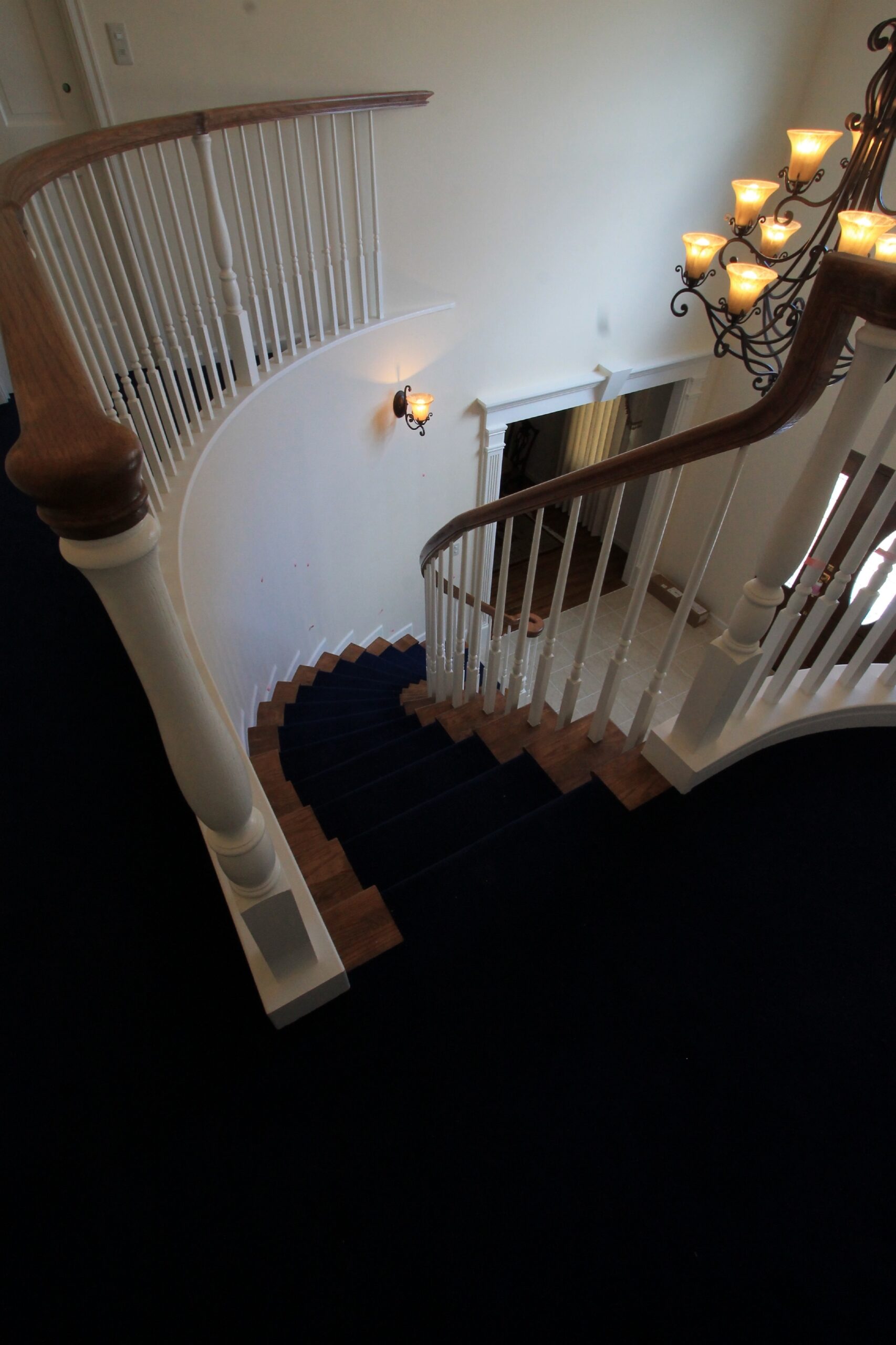アメリカの邸宅を思わせる広々としたエントランスとサーキュラー階段。目の覚めるようなロイヤルブルーの繊毯がエレガントな表情を添えています。アメリカ式の靴のままの暮らしにも対応できるよう、大理石を致き詰めました。