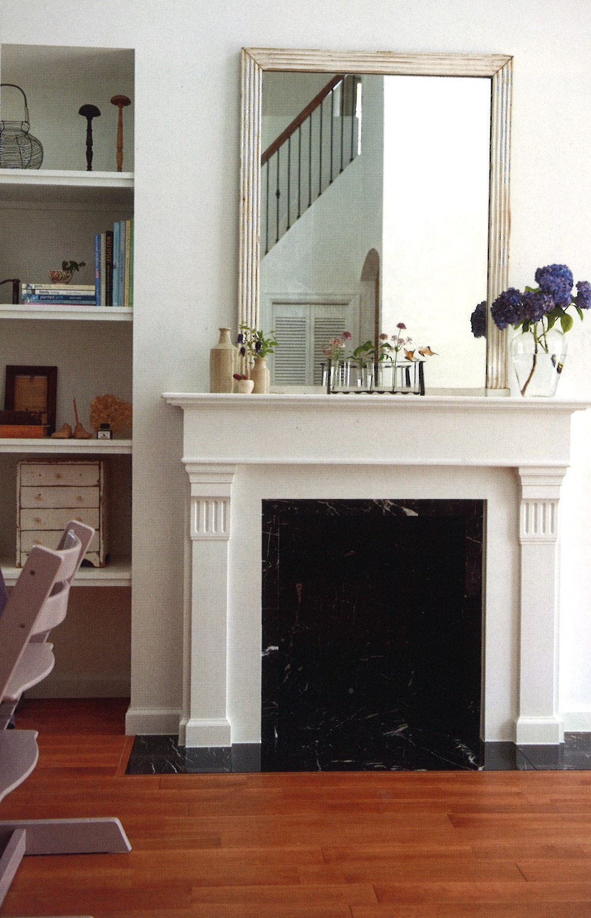 リビングの見せ場ともいえるマントルピースには、アンティークフレームの鏡を合わせて。軽やかなガラスの花器もコーナーを引き立てます。